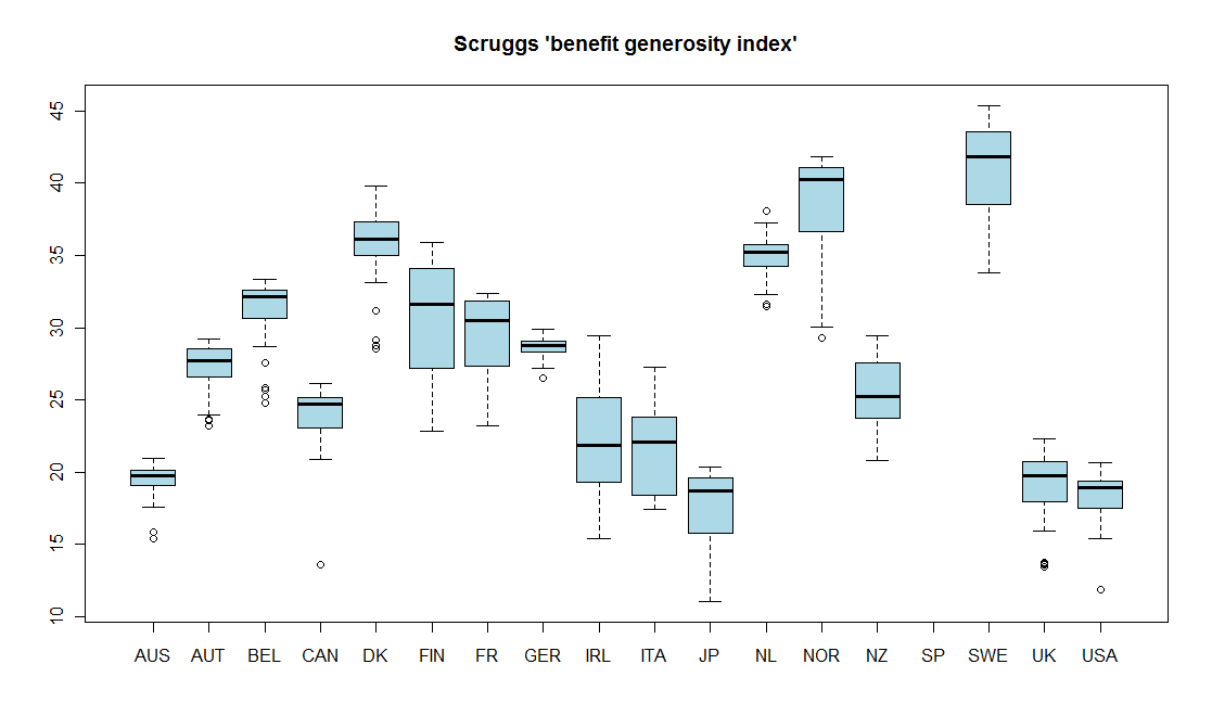 För Sveriges del är det något konstigt här: i Scruggs två mått verkar Sverige ha ett av de mest generösa systemen, men så är inte fallen med OECD:s mått (och Huber och Stephens mått som bygger på OECD-data).