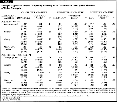 Han kör regressioner med per capita-tillväxt 1974-80 som beroende variabel och fack, regering, deras interaktion, oljeberoende, inkomstniva 1973-74, företagskoordination och konsensusdemokrati som oberoende variabler. Han har alltsa 7 oberoende variabler, i regressioner med n=15! Vansinnigt. Han menar att hans resultat stödjer Left-Labor-tesen, men för det frsta är det barockt att dra slutsatser fran regressioner med 7 oberoende variabler och n=15 och för det andra RÄCKER INTE aren 1974-80 för att dra slutsatser! Han gar vidare med att i enlighet med Garrett och Lange (1986, 1987) lägga till data fram till 1984. Interaktionen mellan fack och vänsterregering har positiva (mellan 0.31 och 0.43) och statistiskt signifikanta effekter.